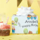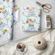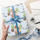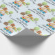 This custom kid's gift wrapping paper features a colourful children's folk and fairy tale theme on a sky blue background. The three little pigs from the classic fairytale are pictured standing near their huts of straw, sticks, and bricks. The Big Bad Wolf is seen creeping in the distance. A sample Happy Birthday message is printed above the illustration, and a sample name is printed below in a whimsical black font. You can personalize the gift wrap to include your own custom name or text.