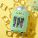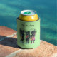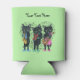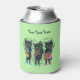 This can or bottle cooler has three musical black cats in bright clothes in pink, green, and blue playing their instruments including a guitar, violin, and saxophone on a heart made of black music notes on light green background. Customise your text on the front and back with the template.
