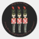 Three nutcrackers, sleek and Christmasy red suited soldiers with black background and script, "A Merry Holiday, a wonderful treat, toy soldiers wish you a pleasant eat"