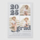 This trendy blue three photo graduation party invitation features a fun retro font, and one curved photo within a three photo grid.