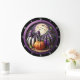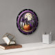 This unique Halloween illustration features a circular frame with three pumpkins under a bright full moon with bats flying. The pumpkins include a black and white striped one with a large purple bow, a purple and green patterned one, and a classic orange pumpkin. The scene has a spooky yet charming feel.