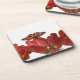 Three red tulips and a monarch butterfly against coaster