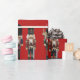 This wrapping paper features three traditional Nutcrackers, one with a pair of cymbals, one with an axe and one with a sword against a dark red background. Perfect to wrap all Christmas presents in.