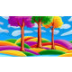 Three trees with different colour leaves on a colourful field with a blue sky and white clouds, vibrant colours,