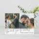 Wedding thank you card with room for three photos, two on the cover and a larger photo on the back. Thank you so much is written across in a hand-writing script. Personalize with your names.