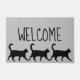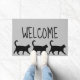 Three whimsical black cats walk across your doormat. Above the cat graphics the word WELCOME is printed in trendy black font. The background of the doormat is light grey. A fun carefree design that will welcome your friends and family to your home. If you prefer a different background color or a different message on your doormat you may use the on-screen tools to easily change the message and the color to match your decor. If you need help please contact me. I'll help you create your unique design!
