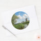 Round photo sticker of three windmills along a canal with boats and reeds under a blue sky with puffy clouds creating a peaceful scene in the dutch countryside of Leidschendam, the Netherlands.