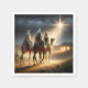 Three travelers on camels journey toward a brightly lit star in the night sky casting a soft glow on the landscape