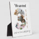 Commemorate your third year of marriage with our Three-Year Wedding Anniversary Photo Collage Tabletop Plaque with Easel. This elegant collage beautifully arranges 6 cherished photos in the shape of a number "3", allowing you to relive the special moments from each month of your journey as a married couple. Expertly printed on premium-quality material, the collage is designed with a sleek built-in easel for easy display on any tabletop or shelf. There is text that reads " We survived 3 years and our love is still strong". If you like, you can personalize this text with your own message instead.