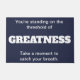 Says "You're standing on the threshold of GREATNESS. Take a moment to catch your breath."
