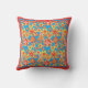 A Throw Pillow or Cushion with an allover pattern of red, orange, yellow flowers on a bright turquoise background, from a handpainted paper collage by Judy Adamson.