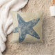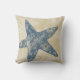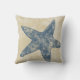 This designer throw pillow has an ocean theme with an image of a starfish in blue on a sand coloured background.