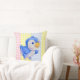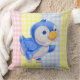 Throw pillow with cute blue bird on multi colour gingham background.