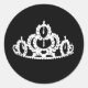 Round sticker shown in black with a litho print of a pageant tiara. Customize this item or buy as is. Add your name.