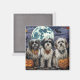 Unleash the spooky spirit with this eerie Halloween design featuring a pack of dogs under a dark, moonlit sky, surrounded by flying bats and glowing pumpkins. Perfect for those who love a touch of frightful fun with their furry friends!