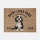Tibetan Terrier Personalized Dog lover welcome doormat. This welcome mat can be personalized with your dog’s name, the slogan can also be changed or you could use a picture of your own dog (make sure it's transparent). Text reads: Daisy lives here…. All treats welcome
