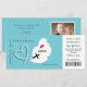 A fun but stylish wedding invitation in a boarding pass/ticket style for couples getting married abroad in Mauritius which is shown in a white map silhouette on teal blue with sweet red love hearts, plane silhouette and white swirling heart shape. The reverse of the boarding pass is easy to customize with your details and personal photo..