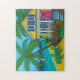 Un tableau de Lisa Lorenz d'une scène tropicale vibrante et joyeuse d'une maison de plage colorée et confortable le long d'une plage de bord de mer turquoise maintenant comme un puzzle.