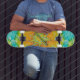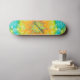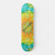 Dd brand skateboard, done in a retro tie dye look, in yellow, orange, teal, pink and green. Personalize the teal coloured text field to suit your needs.