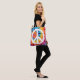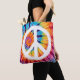 A vibrant tote bag featuring a bold peace sign set against a swirling tie-dye background. The mix of bright blues, fiery oranges, deep purples, and sunny yellows creates a lively and eye-catching design, perfect for spreading positivity and peace in style.