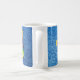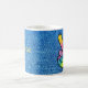 Colourful tie-dye icon from the 1960s peace movement on a background of blue denim. The two-fingered salute represents a preference for peaceful solutions over the alternatives. Psychedelic tie-died fabric may be retro now, but in the 60s it was a hippie fashion statement. The text on the mug says "Peace," but you can customize with your own name or saying and change the font style, size and colour.