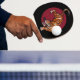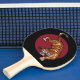 decorative artwork of a big striped asian tiger crouching across a big red circle on a ping pong paddle.
