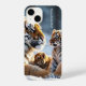 A heartwarming scene of a tigress and her playful cubs nestled in a snowy landscape. The mother’s protective presence and the cubs’ joyful frolic create a captivating display of nature’s delicate beauty and family bonds amidst the serene, wintry backdrop.