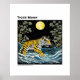 In the Ukiyo-e Japanese art style, a tiger crossing a river at night with the moon and the stars lighting his way.