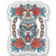A fierce tiger head skull is the centerpiece of this bold tattoo design. A dagger pierces the skull, its hilt adorned with flames and a skull. Chains wrap around the skull and dagger, adding to the image's intensity. Red roses flank the design, symbolizing passion and danger. The overall style is traditional, with bold lines and vibrant colours.