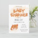 Tiger Themed Baby Shower Invitation Card features a colourfully designed card that features a tiger on the front with a baby shower invitation. On the card, there is a space for the baby shower location, and the invitation has a request for RSVP.