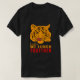 Drawing of a tiger face of black and orange colours. The tiger licks his lips. Text Today we lunch together. Man's t-shirt. Text The tiger is out there on the back. You can change or delete the text as well as the image. Black or dark colour apparel. Do not forget to choose the stile and the colour of the apparel.