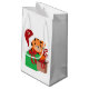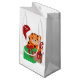 A fun design featuring a whimsical cartoon tiger wearing a Santa hat with Christmas presents in front of him.