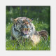 A Sumatran Tiger's big roar. Showing his canine teeth. His face all crunched up. The whiskers clearly visible. No one is going to steal his food.