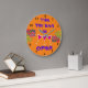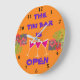 The Tiki Bar is Open is the typography wording, featured with tropical Hawaiian hibiscus flowers and 3 summer cocktail drinks. Done in fun colourful island colours. Keep as is, or change or delete graphic options or the clock numbers. On a Tiki orange background, and purple font text, or pick any colour. Select grey or black clock hands as a selection when done. Your choice of product size. Time for Happy Hour.