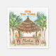 Tropical luau theme cocktail napkins feature a watercolor Tiki bar on the beach (complete with a parrot and cocktails) framed by palm trees, Tiki torches and totems with "Aloha" and "It's Tiki Time" captions in island style fonts. The names and caption can be personalized.