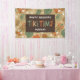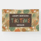 Tiki party theme birthday banner features a rustic wood sign in the centre with "Tiki Time" typography and "Happy Birthday" with a personalized name bordered by Tiki totems, pineapples, hibiscus flowers, palm and monstera leaves. Perfect for tropical, luau and beach theme birthday parties.