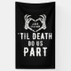 Vertical wedding banner for indoor or outdoor use with the quote "'Til death do us part" and skeleton hands forming a heart. Black party decorations with an editable date and the bride and groom's initials. Be sure to visit our collection to see more coordinating items that match this design for your special event.