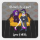 Romantic,  fun and colourful Til Death Do Us Part design depicting a couple of Sugar Skulls with modern purple hair sitting on a vintage velour yellow sofa and damask look alike wallpaper. Customizable typography for you to make it uniquely yours. Ideal sticker for bridal shower favours or thank you cards.