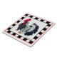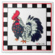 Tile with rooster art drawn by Patricia Villa. Black and white checks border.