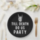 Till death do us party paper plates in black with a skeleton hand and white letters. Spooky party table decorations for a bridal shower, bachelorette, wedding party, or any themed party. Be sure to visit our collection to see more coordinating items that match this design for your special event.