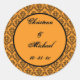 Till Death Hallowedding Round Sticker. This spooky and chic Halloween wedding sticker features a black and orange damask pattern for a unique effect. Matching invitations, response cards, thank you cards and wedding favours are available.