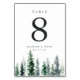 Wintry woodland chic table number cards feature a grouping of watercolor pine trees in hunter green and sage green. Personalize with each table number, with your names and wedding date beneath. Design repeats on reverse side. Coordinates with our Timber Grove wedding invitation suite.