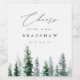 Elevate your wedding bar or favour table with this elegant wine label from the Timber Grove collection by Redwood & Vine Design Co. A row of watercolor pine trees stretches across the bottom, with a graceful script and serif combination above to showcase your names and wedding date. Perfect for outdoor weddings, winter lodge celebrations, or rustic vineyard receptions. Fully customizable to fit any event style.