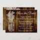 Cartes d'annonce de mariage "Save the date". Image d'un pot Mason tamponné en blanc, sur un fond de planches en bois brun foncé (pas de bois réel). Un thème extérieur semi-grunge pour un mariage d'été à la campagne ou dans une cabane. Des planches en bois brun chocolat foncé provenant d'une clôture ou de planches de sol antiques contrastent avec une image découpée en blanc d'un pot Mason avec du baby's breath et d'autres fleurs sauvages en dentelle. Tous les modèles Copyright © www.CustomInvitesOnline.com
