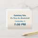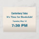Postcard for bookclub announcement has room for date, time and name of book. Blue letters on background full of a sea of English words.