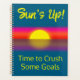 Keep track of your progress with this cute planner. It features sunrise artwork with the phrase "Sun's Up! Time to Crush Some Goals" in bright yellow. A positive message to keep you encouraged.