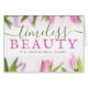 Remind a lady you know how special she is with this elegant calligraphy script lettering style typography design featuring the message, "Timeless Beauty. It's Undeniably Yours". Design is accented with pink tulips on top and bottom border. inside has this message (can be customized)"Some women possess a rare kind of beauty, one that shines from the inside out, filling the world around them with cheer, comfort and hope. That kind of beauty is authentic, inspiring, timeless. It's undeniably yours." Back includes elegant floral decorative accents on pink background.