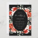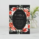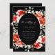 This wedding invitation features a sophisticated design with a black oval centerpiece framed by vibrant red and pink roses. Elegant white script details the couple's names, "Sierra Brown and Brandon Adams," along with the event date, time, and venue: "The St. Regis Atlanta." The classic floral aesthetic paired with the dark background creates a timeless and romantic feel.