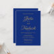 The design features customizable wedding invitation details in classy gold script typography; on always elegant and sophisticated royal blue background.