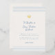 Timeless baptism invitation that combines soft blue stripes on light beige background, a delicate gold foil shell cross symbol, and handscript font. Elegant and modern.